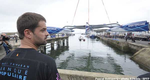 Les visages des membres du Team Banque Populaire pouvaient alors s’ouvrir pour laisser paraître un premier sourire de satisfaction alors que dans la foulée, la dérive trouvait sa place dans le puis de la coque centrale. Toujours selon un déroulé d’une fluidité exemplaire, le mâtage suivait et « l’envolée » spectaculaire de l’espar de 43 mètres laissait l’assistance une nouvelle fois encore stupéfaite tant l’ensemble donnait une impression de légèreté. Suivant une mécanique parfaitement huilée, le Maxi Trimaran Banque Populaire V quittait son premier bain au moteur, sur un mode autonome, pour rallier aux environs de 17 heures, son ponton à la base des sous-marins, son port d’attache à Lorient .