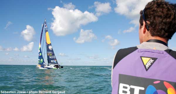 Sébastien Josse a profité d’une belle journée ensoleillée mardi aux Sables d’Olonne pour sortir en mer avec ses préparateurs. L’objectif était d’effectuer un dernier contrôle des voiles de son 60 pieds. Même d’un point de vue extérieur comme le montre cette première image de Bernard Gergaud qui a embarqué sur BT pour l’occasion.