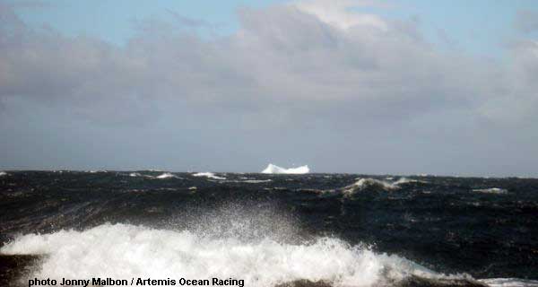 From Artemis Ocean Racing II Jonny sent the following message : “03:30 GMT this morning, iceberg spotted ! Lots of squalls this morning, with 40 knots of freezing wind in them and raining ice. Came through one, and saw a target on the radar – as I came out of the squall there she was, a very big iceberg. Well over 400m long and 60-80m high I would say. Passed to leeward of it by 4 miles, but still, makes you wonder about sailing so fast through the night !!!”