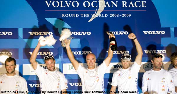 Fighting for every inch, Telefónica Blue, skippered by Dutchman Bouwe Bekking, crossed the finish line at the end of leg three of the Volvo Ocean Race to score an emphatic victory in Singapore today at 1451 GMT (2251 local time).