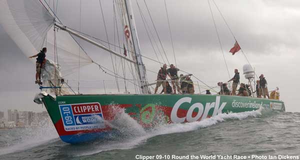 The jubilant crew of Cork, Ireland, has arrived in Cape Town after taking victory in Race 3, the South Atlantic leg, of the Clipper 09-10 Round the World Yacht Race. They crossed the finish line in Table Bay at 1638 local time (1438 GMT), accompanied by a pod of dolphins surfing down the face of the waves. Earlier in the day the cloud had lifted to reveal the iconic shape of Table Mountain which dominates the Cape Town skyline but it was in brooding conditions that the team crossed the line with Capetonian crew member, Marlon Jones, 20, at the helm.
