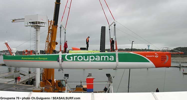 "Il ne s’agit pas du Groupama 4 mais du Groupama 70. C’est le bateau neuf qui recevra le numéro 4. Tout comme l’Extreme 40 ’Groupama 40’, il s’agit d’un bateau que l’on n’a pas construit et il n’entre pas dans l’ordre des Groupama" explique Yann Riou avant les manoeuvres de levée de la coque du 70 pieds.