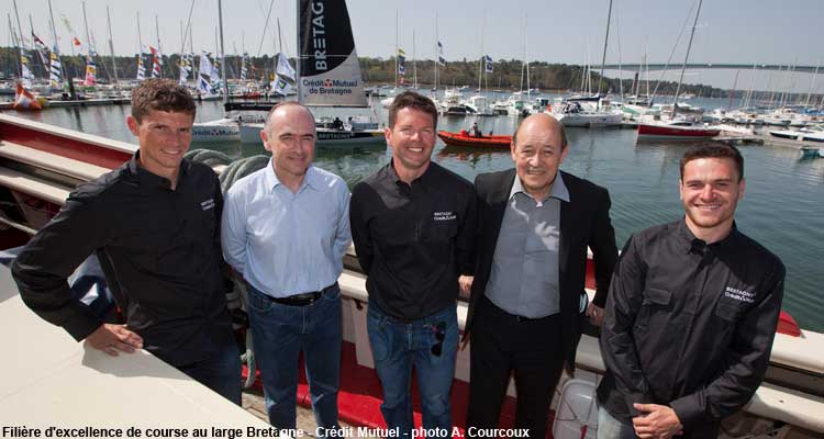 Vendredi 8 avril à Bénodet, Jean-Yves Le Drian, Président du Conseil régional de Bretagne, et Jean-Pierre Denis, Président du Crédit Mutuel Arkéa et du Crédit Mutuel de Bretagne, ont présenté la filière d’excellence de course au large Bretagne - Crédit Mutuel. Cet engagement inédit qui visera à détecter, former et conforter des champions ainsi qu’à porter haut les couleurs de la Bretagne.