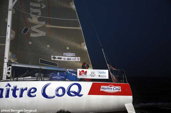 Jérémie Beyou, skipper Maître CoQ : « Cette Solo Maître CoQ fut une très belle course d’entraînement ! Nous avons eu des conditions météo très variées avec de la « pétole » (absence de vent) le premier jour et jusqu’à 23 nœuds, sous spi, cette nuit. Ça a été vraiment intense d’un bout à l’autre ! Nous étions un petit groupe de quatre bateaux avec Yann Eliès (Groupe Quéguiner) , Thierry Chabagny (Gedimat) , Gérald Veniard et Jeanne Grégoire (Garage David – Scutum) , en double, à batailler du début à la fin.