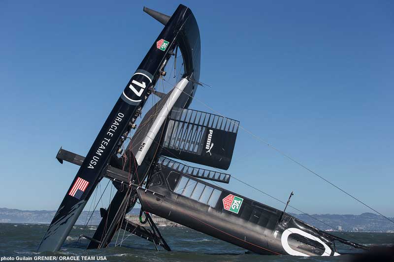 ORACLE TEAM USA, le defender de la 34e America’s Cup, a chaviré à bord de son catamaran géant, l’AC72, dans la baie de San Francisco, au cours d’une sortie d’entraînement. Fort heureusement, tous les membres de l’équipage sont indemnes. -